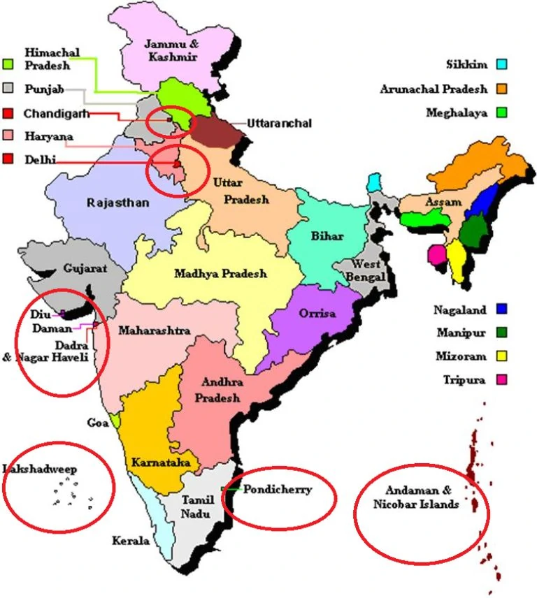 - अंडमान और निकोबार द्वीप समूह (राजधानी: पोर्ट ब्लेयर)